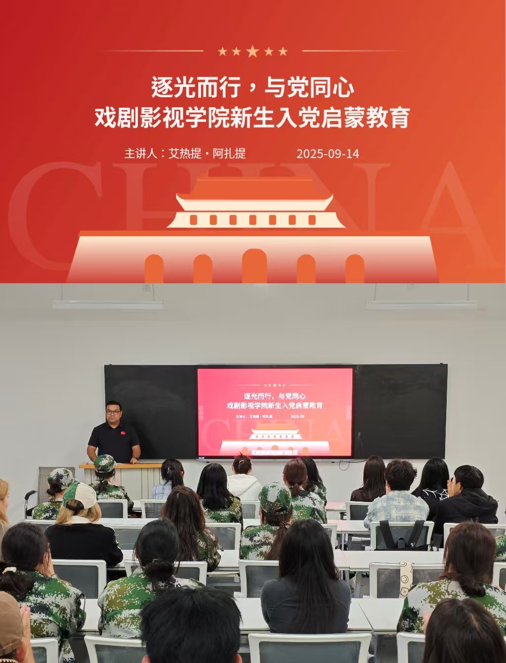 2025年9月14日晚,戏剧影视学院入党启蒙教育专题讲座在208教室顺利举行。学院党委书记艾热提·阿扎提以“逐光而行,与党同心”为主题,为表演、舞台美术设计、戏剧影视文学三个专业的86名新生带来了一堂兼具思想深度与专业温度的入党启蒙课。