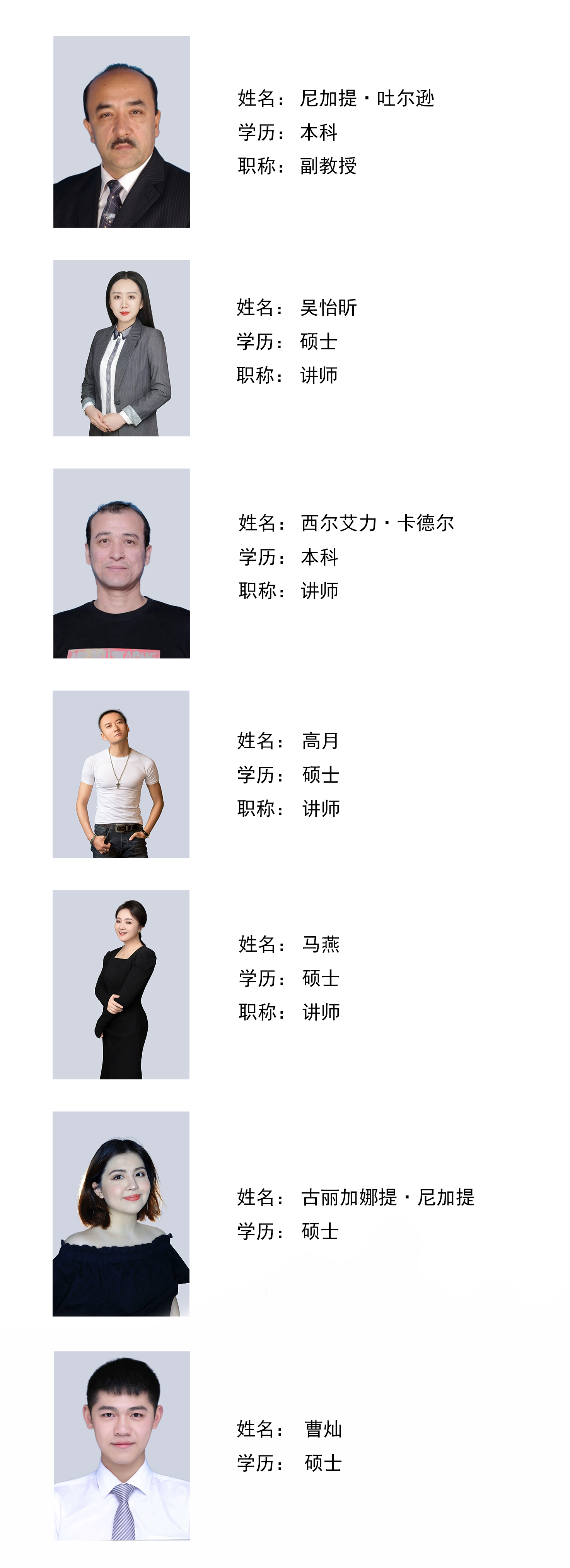 戏剧影视学院表演系现有教师8人,其中教授2名,副教授2名,讲师3名,助教1名;团队教师分别毕业于法国第八大学、中国传媒大学、中央戏剧学院、北京电影学院、上海戏剧学院、新疆艺术学院等学校,团队人员均有影视戏剧表演教学、导演、影视戏剧表演研究、表演等工作经历。具备丰富的教学和实践经验。表演系教师先后参与电影、电视剧拍摄,参演了《冰山上的来客》《木卡姆往事》《广州来了个新疆娃》《阿娜尔汗》《库尔班大叔上北京》 《都是一家人》《平凡英雄》《阿凡提》等多部影视作品,并担任主要角色。教师科研成果丰硕,共编写教材2部,发表论文120余篇。
